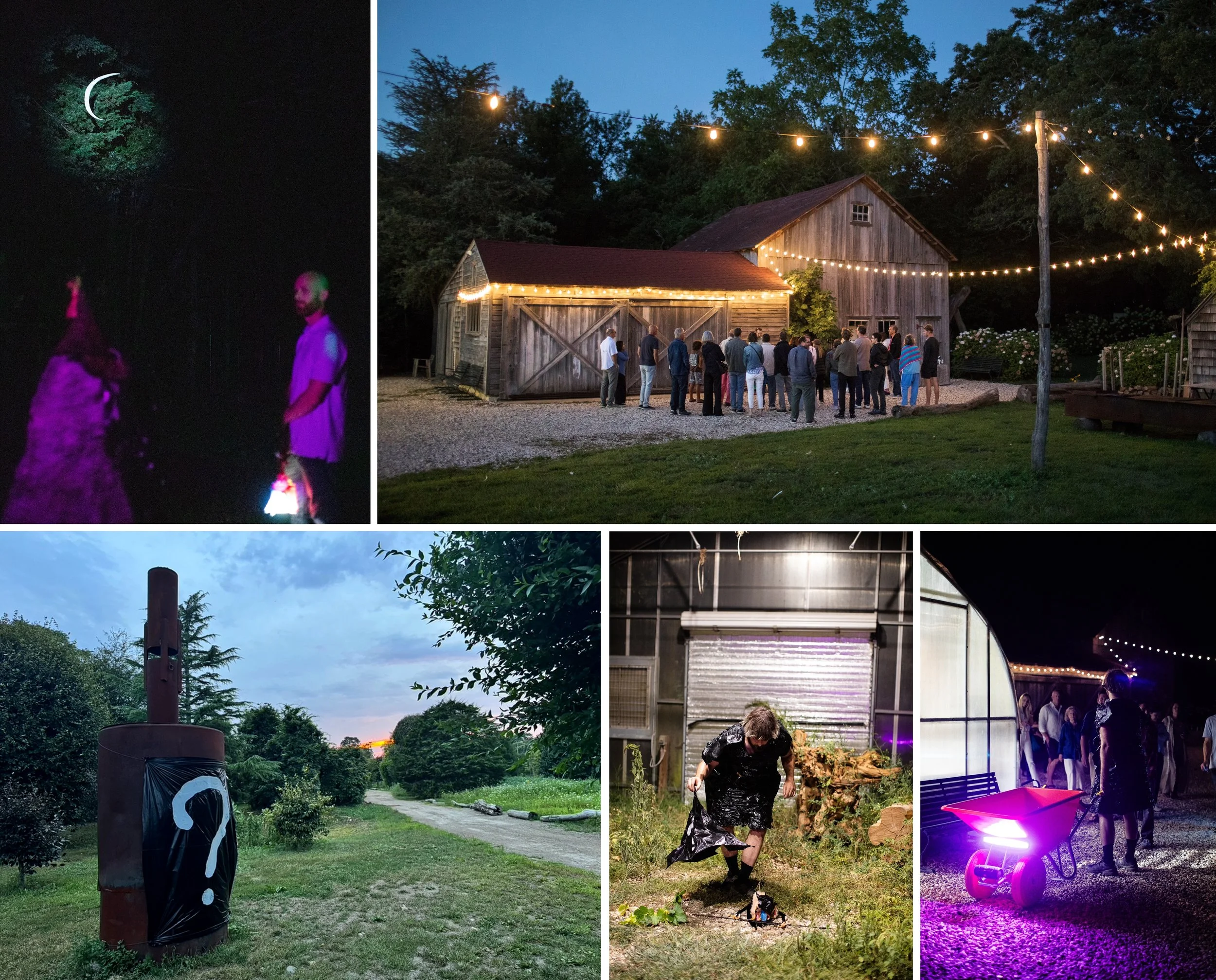 Prior to the audience being guided through the Folly Tree Arboretum, they were brought into the barn to be “born into the world of the work”. They would live an entire life within the world, and then “die” at the end, taken on The Long Walk to the Final Table to account for all of the choices that were made along the way. Depending on actions taken throughout, how the audience members interacted with different characters, it would change the nature of what could be revealed at The Final Table. Throughout the evening, audience members could respond to myself, various characters that we met along the way, and also to “mysteries” planted throughout the arboretum. They were equipped with toold along the way as oparticular audience members were invited to take on roles like “Bell Ringer”, “Light Warden”, and “Bard”, each of which had their own set of tools for interacting.
